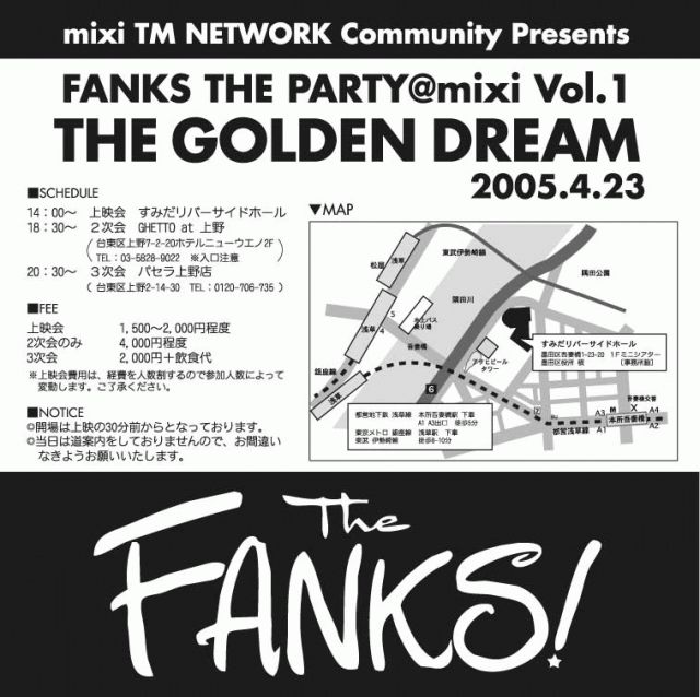 TM NETWORKコミュニティ(@mixi)メンバー1500名突破とTM NETWORKデビュー21周年を記念して、TM NETWORK/TMNの映像鑑賞会を開催します。以前はイベントとして開催することを考えてましたが、参加者数が少ないので通常オフのノリでやることにしました。 映像内容については、製品化された映像と製品化されていない映像の双方から様々なものを選りすぐって上映する予定です。 会場の都合により、定員は40名ですがまあ心配はないかと。 内容についてのお問い合わせ等はこのトピックでどうぞ。 以下の参加登録方法を**よく読んだ上で**、参加登録