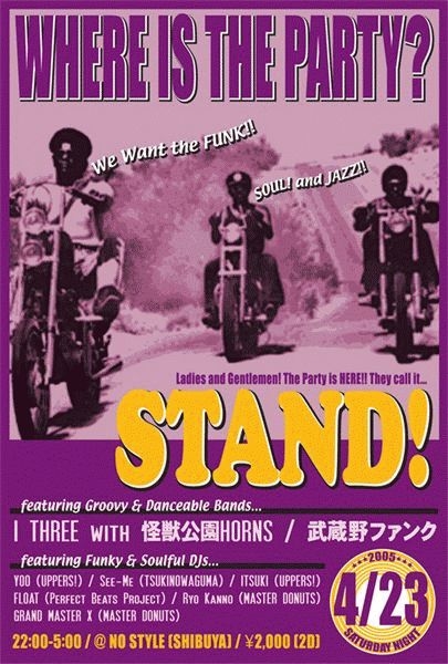 どうも毎度手前味噌ですいません・・・。 イベント告知用のスレでも挙げてますが、 一応こちらでも挙げさせてください (多重投稿ご容赦ください) 〜 funk, soul, rare groove, jazz, crossover 〜 ::: CLUB ::: NO STYLE (SHIBUYA-TOKYO / 03-3462-4375) →【http://www.clubnostyle.com/】 ::: CHARGE ::: \2,000 (2drinks) ::: LIVE ::: I THREE with 怪獣公園HORNS →【http://it.qup.cc/】 武蔵野ファンク →【http://sound.jp/musashinofunk/】 ::: DJ ::: YOO (UPPERS!) →【http://mixi.j