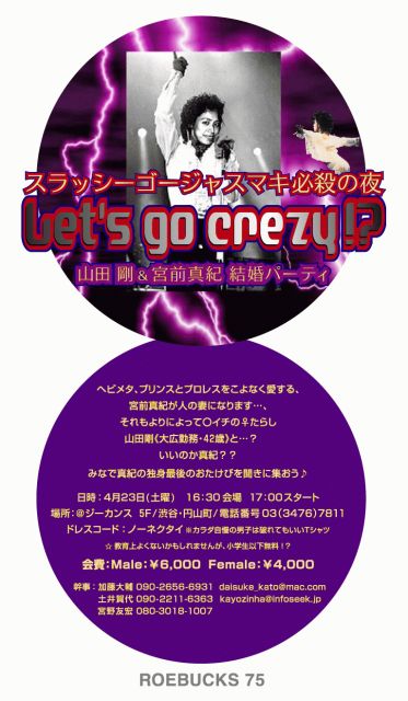 おれんちコミュの皆様、ご無沙汰しております。 私事ではございますがヤマタケこと山田剛さんとユリアこと宮前真紀の結婚パーティー(いわゆる二次会)が決まりましたのでご報告いたします。 友人、お世話になった方などをご招待予定でございますのでふるってご参加くださいませ。 ドレスコードはノーネクタイで男子は破られても良いT-シャツで来ると尚良し。(其の場合は着替えをもってきましょう) 女子は肌出し奨励しまっす。(全部はダメよ-。) 日時:2005/4/23 日本時間で17時スタート 場所:渋谷アットジーカンズ(円山町/道玄坂上を