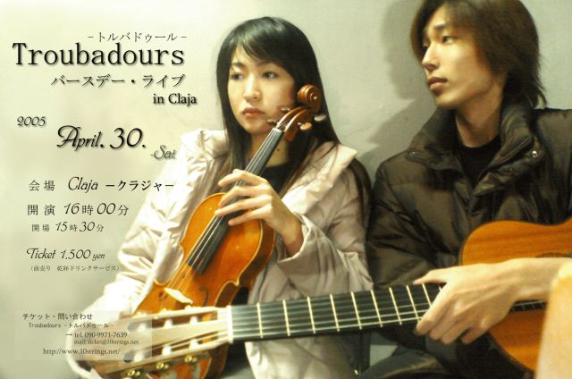 今月末、藤沢本町のライブハウス「Claja」でライブやります! メンバー二人の誕生日記念で、ケーキイベント有。 またまた多ジャンルなプログラムです。 クラシック、オリジナル、コンクール受賞したてのタンゴ・・・ そして今回はボサノバにドラムが参加。 さらに今回は前回好評だったギターソロも充実。 ぜひ聴きにきて下さい! ★トルバドゥール・バースデー・ライブ★ 4月30日(土)16時〜 会場:Claja/クラジャ(小田急線藤沢本町駅徒歩5分) 出演:皆川真里奈(Vn)&酒井良祥(Gt) チケット:¥1,5