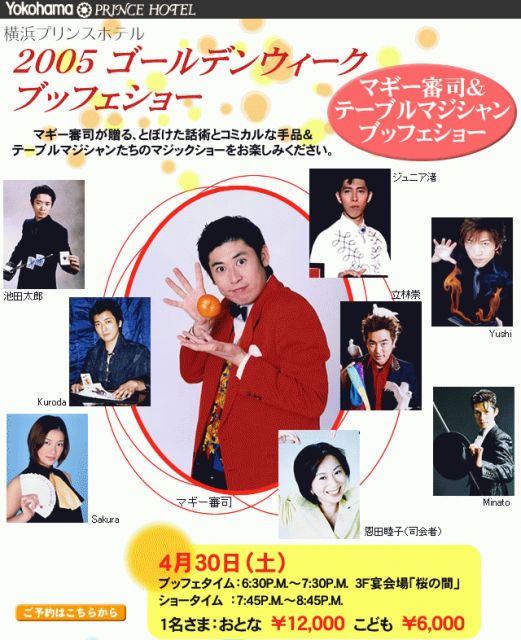 4/30 横浜プリンスにてブッフェショー。 詳しくは↓ http://www.princehotels.co.jp/golden-week2005/event/yokohama/shows/