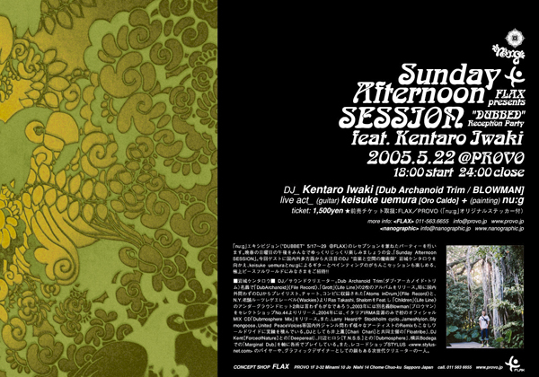 start18:00〜close24:00 ticket: 1,500yen ★前売チケット (オリジナルステッカー付) DJ: Kentaro Iwaki [Dub Archanoid Trim / BLOWMAN] live act: (guitar) keisuke uemura [Oro Caldo] + (painting) nu:g エキシビジョン"DUBBET"のレセプションを兼ねたパーティーを行います。晩春の日曜日の午後をみんなでゆっくりじっくり楽しみましょうの会、「Sunday Afternoon SESSION」。今回ゲストに国内外多方面から大注目のDJ "音楽と空間の魔術師" 岩城ケンタロウを向かえ、keisuke uemuraとnu:gによるギターとペインティングのがちんこセ