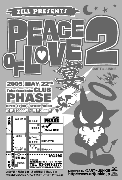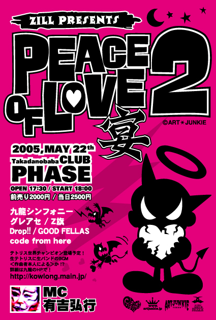 PEACE OF LOVE 2新着情報です! 出演者が決定いたしました! 出演順は未定のため順不同ですが、発表いたします! 開場17:30開演18:00から、各バンド30分づつで22:00終了予定です。 MCはなんと元猿岩石の有吉弘行君!! □PEACE OF LOVE 2 『宴』 2005.05.22 at takadanobaba CLUB PHASE http://www.deseo.co.jp/phase OPEN 17:30 / START 18:00 前売り2000円/当日2500円 九龍シンフォニー(Kow Long Symphonie) http://kowlong.main.jp/ グレアセ http://www.gre-ase.com Z旗 http://www.starball.jp/z-ki Drop!! htt