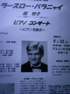 リスト音楽院教授のわが恩師、バラニャイ先生をお迎えして、コンサートを行います。 プログラムは、    ベートーヴェン 悲愴ソナタ    シューベルト  即興曲 作品90−2,4            ファンタジー (連弾)    ショパン    バラード第4番  (じゅこ)            スケルツォ第1番            ノクターン 作品27−1,2    リスト     メフィストワルツ       チケット代 3000円       また、先生に日本の美を堪能していただきたく