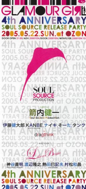 管理人様、告知失礼致します。 名古屋でのSoul Sourceリリースパーティ詳細は下記の通りです。盛大に行います。よろしければ遊びに来て下さい!! 『GLAMOUR GIRL 4th ANNIVERSARY ~SOUL SOURCE RELEASE PARTY』 2005.5.22.SUN @OZON(052-261-5999) OPEN 21:00 ADV 2000YEN/DOOR 2500YEN/with flyer 2500(1D) GUEST DJ 箭内健一(Soul Source Production) DJ 伊藤健大郎/KANBE/ナイキ/そーた/タンク VJ dragthink BLUE FROOR DJ's「Like a Bossa」 神谷直明/熱田巳記夫/渡辺隆之/村松和昌 【チケット発売所&お問い合わせ先】