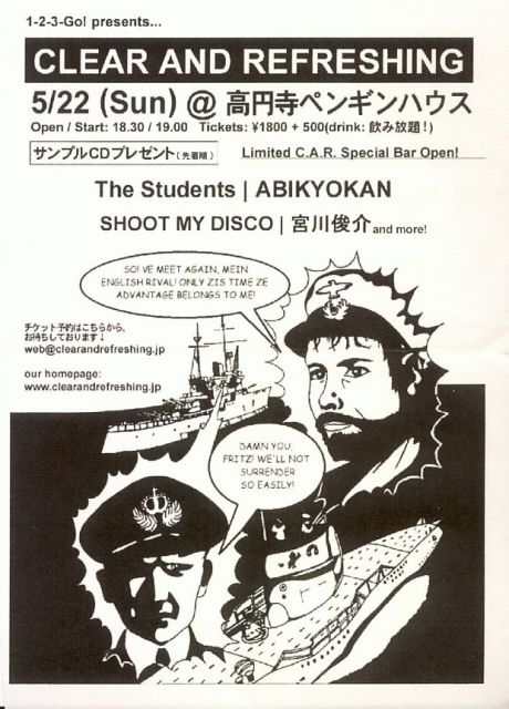 05/22sun [CLEAR AND REFRESHING] @高円寺ペンギンハウス w/ THE STUDENTS / ABIKYOKAN /宮川俊介 / audipop ☆open/start=18:30/19:00 SMDCstart=21:40 ADV/DOOR=\1800/1800(DRINK別→でも飲み放題!) ☆なんとこの日はドリンク飲み放題! 高円寺の夜な夜な酌み交わしナイト! ペンギンハウスWEB:http://www3.plala.or.jp/FREEDOM/penguin/home/home.html