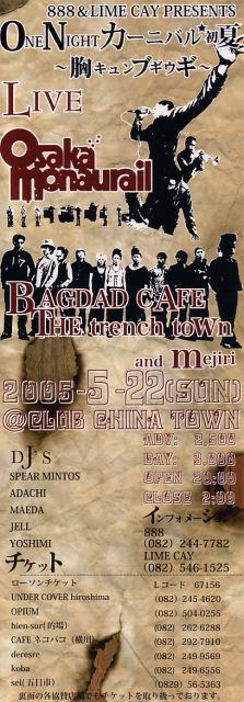 888&LIME CAY presents One night カーニバル 初夏〜胸キュンブギウギ〜 day:  5/22 20:00start at:  club CHINA TOWN live: OSAKA MONAURAIL, BAGDAD CAFE THE trench town MEJIRI DJ:  SPEARMINTOS / JELL / ADACHI /      MAEDA / YOSHIMI OPEN: 20:00 CLOSE: 2:00 料金: \2,500/\3,000 (adv/door) 問合せ:BAR LIMECAY 082-546-1525、888(みつばち) 082-244-7782