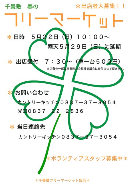 千畳敷にて年2回やってます。 出店受付 7:30〜(車1台500円) 問い合わせ カントリーキッチン 0837−37−3054 光田 0837−22−2836 当日連絡先 カントリーキッチン0837−37−3054
