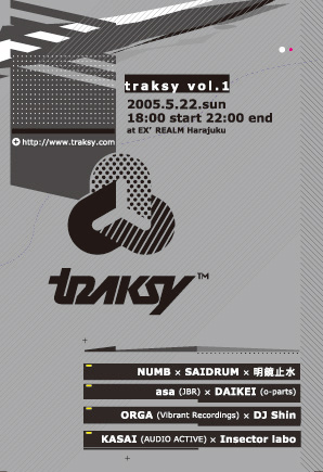 traksy vol.1 @ EX'REALM B1F(http://www.exrealm.com/) 18:00 open 22:00 close fee: \2000 \1500 with flyer http://www.traksy.com/ 5月22日の夕方、traksyによる初のイベントでは、テクノロジーをハック/コントロールすることを可能にし、独自の世界観を確立したアーティストたちのバトルが繰り広げられる。既存の価値観や基準に惑わされることなく作り出された強烈な個性と個性の"せめぎ合い"と"調和"を生むコラボレーションをtraksy vol.1で体感することができる。 <Special Collaboration Live> NUMB(Revirth/HOON )×SAID