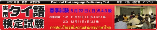 試験級: 5級、4級、3級 願書受付期間:2005年3月7日(月)〜5月9日(月)当日消印有効 願書:http://www.thaigokentei.com/data/gansyo.pdf 実用タイ語検定試験【受験資格】 年齢、性別、国籍などに制限はなく、どなたでも受験可能です。 実用タイ語検定試験【試験会場】 東京会場  名古屋会場  大阪会場  バンコク会場 ※都合により試験会場が変更となる場合がございます。 実用タイ語検定試験【検定料免除制度】 成績優秀者は次回検定料に限り奨学金として検定料が免除されます。 (1級の成績優秀者の方には