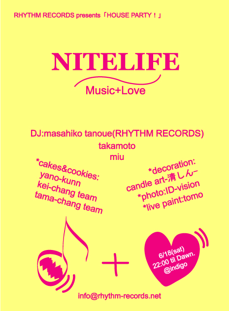 前回5/28(sat)のパーティー第一回目が大好評、大盛況、笑顔、笑顔で始まったNEW STYLE PARTYです。 http://www.ismusic.ne.jp/kosef/nitelife 写真から楽しさが伝わった方は是非、今度は一緒に楽しみましょう!! 音楽を楽しむのは勿論のこと、雰囲気も楽しめるように、店内にはデコ、そしてクッキー、ケーキ等の手作りの「お菓子」もご用意しています。 「音楽」と「お菓子」と「人」があれば、いつでも、どこでも「PARTY!」は出来ます!! みんなで楽しみましょう!! 「PARTY!」なのですから! お待ちしています!!! NIT