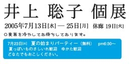 2005.7/13〜井上聡子展 黄色の昼寝 青い夜更かし 夏休みは特別な時間です。 高知遺産のメンバーでも有り絵本が大好きな井上聡子の初個展 油彩やイラストなど十数点を展示予定 ●夏の始まりパーティー 7月23日[土](無料) pm6:30〜 夏っぽいものさしいれ歓迎 ゆかた歓迎 どなたでもおこしください。