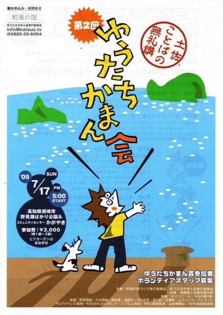 イベント内容 第1部野見湾の海辺のビアガーデン(17:00〜21:00) 潮風を感じながらのんびり、まったり漁港の夏祭り気分。参加自由です。 第2部ゆうたちかまん会(19:30〜20:30) 参加費¥3,00 優勝商品:土佐湾クルージング付きペア宿泊券(3万円相当) 口が裂けても言えないことをいってしまうことをテーマとします。発言者の顔と声が判らないようにシルエット越し。持ち時間3分。会場の反響を測定器で測り優勝者を決定。 第3部語り合いの宴(21:00〜22:00) 隣接のコミュニティセンターへ移り地元食材を肴に酒を酌み交わしましょ