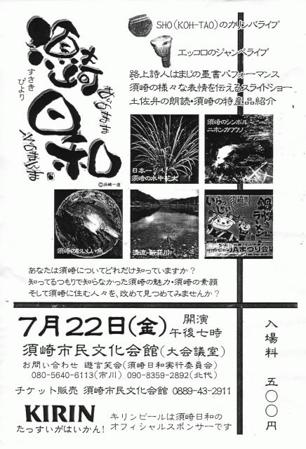 あなたは須崎についてどれだけ知っていますか? 知ってるつもりで知らなかった須崎の魅力・須崎の素顔・そして須崎に住む人々を、改めて見つめてみませんか? SHO カリンバライブ エッコロのジャンベライブ 路上詩人 はまじの墨書パフォーマンス 須崎の様々な表情を伝えるスライドショー 土佐弁の朗読 須崎の物産品の紹介 問い合わせ先 080-5640-6113(市川) 090-8359-2892(北代) 入場料・・・¥500