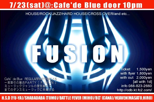 ●7/23[sat] FUSION door10pm ALL GENRE DJS PARTY TOMO/CANA/MASATO/HIRO/YU-YA/MIHO ticket 1,500yen w/f 1,800yen w/out 2,000yen all with 1d 当店、各週末レギュラーDJ陣が一夜にして集結し 様々なダンスミュージックジャンルでお届けする融合プレイ。 今宵一夜でレギュラーパーティー全てを体感する事ができる! 是非お越し下さいね!