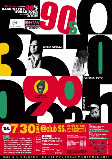 90'sというキーワードが街中のいたる所で見られるようになり、盛上がりを感じさせる2005年の今クラブシーンが盛上がり、ファッションも様々な潮流を生んだ90年代を今年日本上陸15周年を迎えるHMVと90年代のメインアイコンとも言えるG-SHOCKが新しい解釈・新たなムーブメントを創るべく、ファッションなどの有名ブランドも多数参加して行なわれるProjectが「BACK TO THE 90's」