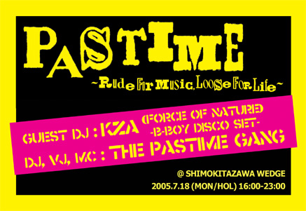こんにちわ。パスタイムで二代目マスコット務めさせてもらってます東京は世田谷区から参りましたドーナツです。今月のパスタイムは、「ザ・パスタイム・ギャング VS サマー・ソルジャー エピソード1:ミルクマンの逆襲」と題して、「あの夏」(注1)にリベンジするためミルクマンhttp://mixi.jp/show_friend.pl?id=237317が立ち上がります(注2)!!!!!!!!でもって今月のサマー・ソルジャーは、フォース・オブ・ネイチャーよりお越しのKZA兄さん(注3)!!!!!!!!!!!!!なんでもパスタイムのためにスペシャルセットで臨んでくれるんだとさ。