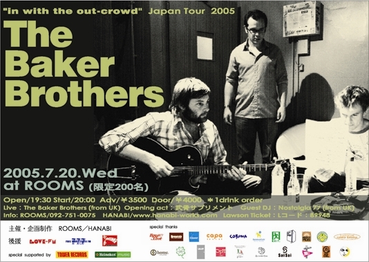 The Baker Brothers只今絶好調!全国のタワレコで売れに売れててほとんど品切れ状態です!東京公演は2days開催で、フロントアクトが、YOUR SONG IS GOOD、CENTRAL、Loopsession、Airbusなどが参加と大いに盛り上がってますよ。今回はこの春リリースした2枚目となるライブ盤"in with the out-crowd"引っ