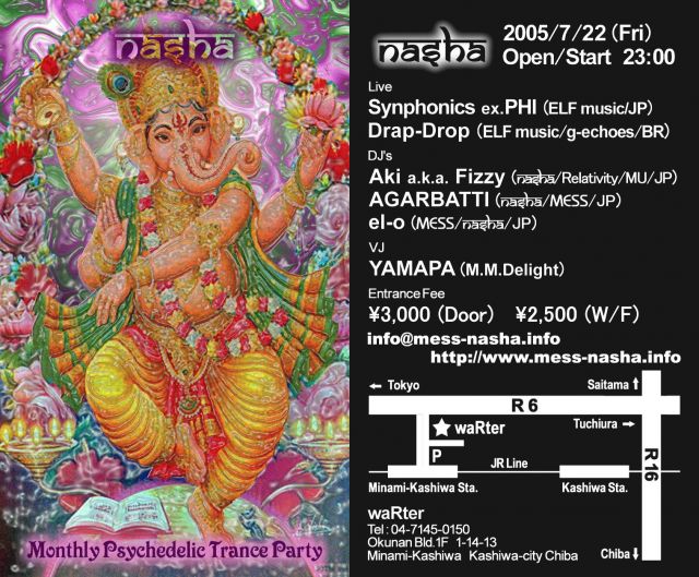 ШШШШШШШШШШШШШШШШШШШШШШШ Nasha presents Nasha Monthly Psychedelic Trance Party @waRter (Kashiwa) 2005/7/22(Fri) start 23:00 close 08:00 ШШШШШШШШШШШШШШШШШШШШШШШ Live Drap-Drop (ELF music/g-echoes) Synphonics ex.PHI (ELF music) 11 (xxx) Fizzy (Nasha/Relativity/MU/TranceRink) DJ's HAJIME (Psychedelic Laboratry)
