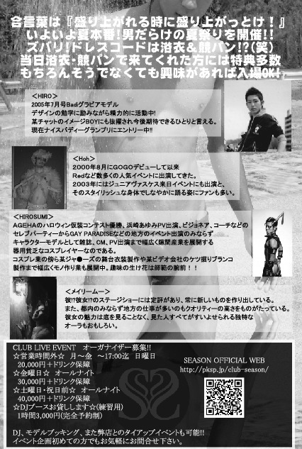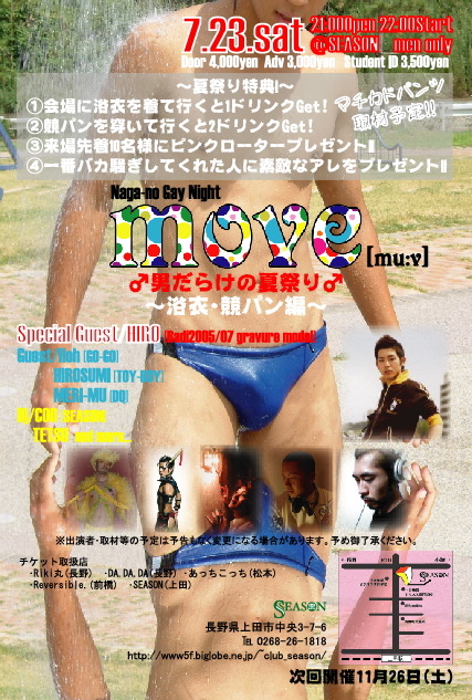 7月23日(土) 21:00〜 move[mu:v] ♂男だらけの夏祭り♂〜浴衣・競○ン編〜 men only 4,000円 ADV3,000円 学割3,500円※先着入場、衣・競○ンでの入場者プレゼント有 badi取材決定!! チケット取扱店 Riki丸(長野) DA.DA.DA(長野) あっちこっち(松本) Reversible.(前橋) SEASON Special Guest/HIRO[Badi2005/07 gravure model] Guest/MASAKAZU[GO-GO] HIROSUMI[TOY BOY] MEIRI-MU[DQ] Dj/COO[SEASON] TETSU 県内最大のゲイイベントが開催!! 出演者も超豪華で、感動あり、笑いありと最高の夏祭り! ズバ