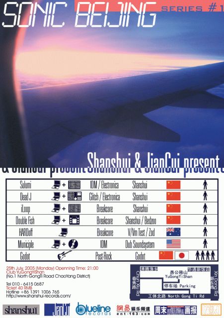 Hard Offが出ます。 北京にお住いの方、またはこの日にたまたま北京にいらっしゃる方、是非遊びに来て下さい! 2005.7/25(mon) 『SONIC BEIJING#01/ 音速北京vol.1』 @Yu Gong Yi Shan/愚公移山 (Beijing, China) Tel:010-6415-0687 START/21:00〜 Ticket:40RMB Artists: Hardoff (v/vm,zod) Municiple (language lab,dub soundsystem) iLoop (shanshui) Sulumi (shanshui) Dead J (shanshui) Double Fish (shanshui,bedzoo) Godot(godot) for more info:http://www.shanshui-records.com/