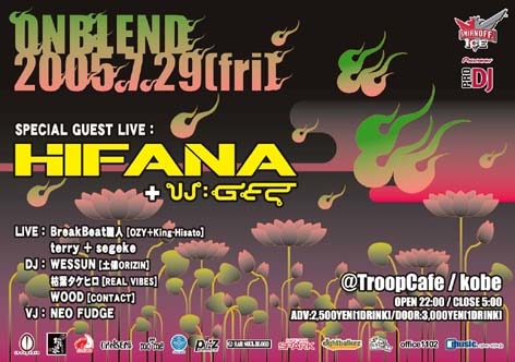 『ONBLEND』 2005年7月29日[金曜日] 22:00~5:00 at TroopCafe/KOBE ?078-321-3130 ADV. 2,500yen[1drink]/DOOR. 3,000yen[1drink] GUEST LIVE :HIFANA + VJ GEC LIVE:Break Beat 職人[OZY+KING-HISATO] TERRY+SEGEKI DJ:WESSUN[土俵ORIZIN] 枯葉タケヒロ[REAL VIBES] WOOD[CONTACT] VJ:NEO FUDGE HIFANA KEIZOmachine!とジューシーによるブレイクビーツユニット。1998年より活動始。プログラミングやシーケンスをいっさい使用せずリアルタイムにサンプラーのパッドを叩いてビートを刻み、スクラッチ