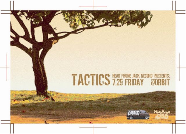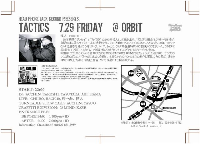 ■TACTICS■@ORBIT/tsuchiura ■DJS Acchin, Takeshi, Yasutaka, Aki, Hama ■LIVE 怪人,旅一派,BACK-10,Chi-Bo ■TURNTABLE SHOW CASE Acchin, Yasuo ■GRAFFITI EXIVISION 02MIND[KANGRHYTHM★], KAZE ■PRICE■ □Befoer 24am \1,500/1D □After 24am \2,000/1D HEADPHONEJACK家族総出の新プロジェクト始動!!! 是非、遊びに来て下さい。