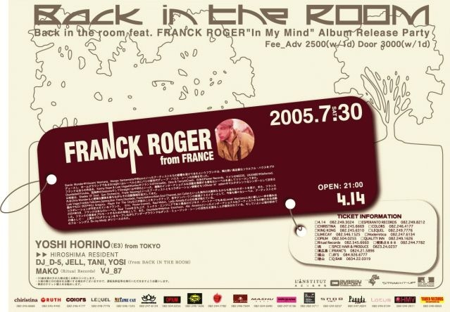 自らのレーベルREAL TONEも立上げ、今年のマイアミWMC2005で要注目の1人、フランスの新星クリエイター/DJのフランク・ロジャーが来日。ルイヴェガ直系の音作りに、彼のバックボーンであるFRENCH HOUSE独特の繊細さをも併せもつ素晴らしい楽曲の数々は、今がまさにリリースラッシュで、HOUSEファンのみならず、JAZZファンをも魅了する事間