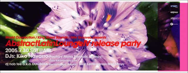 スペインはイビザ島、マジョルカ島にあるPachaのレジデントDJとして、絶大な人気を誇る"Kiko Navarro"。"Xel-Ha"、"Shining"の2曲を楽曲提供した"Abstract Latin Lounge"のRelease partyに、Receptortuneから"Lemongrass feat.真夢/MAYU"、"dj nob tee a.k.a. DUGSOUL"が参加。情感豊かなラテンの甘い旋律と哀愁漂う夕暮れのエッセンスに、緩やかに心地よいサウンドが織りなす、ヨーロッパのスタイリッシュが代官山Airに凝縮された、Dance&Chill out パーティー!!