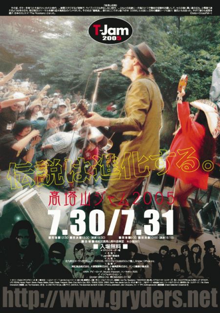 2005年7月30日(土)12時30分開場、 13時開演 「高塔山ジャム2005」 会場:北九州市若松区高塔山音楽堂※小雨決行 入場無料(1ドリンクオーダー制) <MC>Dobb(クロスFM) T-Jamセッション <シーナ、鮎川誠、渡邉信之、川嶋一秀(シーナ&ザ・ロケッツ)、 TAKAROCK (赤と黒、イジワルケイオールスターズ)他、 NO STARS INNOVATION(池畑潤二 ex.The Roosters)、 南 浩二&CNSTRCTRS(ex.人間クラブ) BARAKA、The dobbrock (ex.NEW DOBB)、hi*limits、UP STEADY、 COUNTERS(ex.GUNN)、brainwash、UFO BEAM、 Velvet Pea