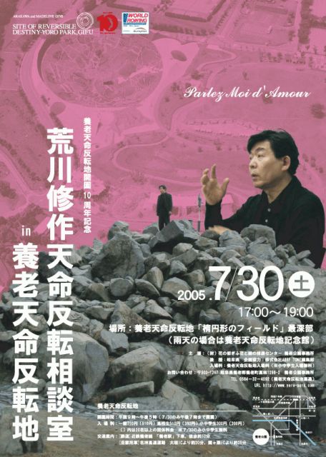 荒川修作さんが養老天命反転地の10周年記念でイベントを行うみたいです。 誰か行くひといませんか〜? 今年秋、体験型テーマパークとして岐阜県養老町に建設された「養老天命反転地」は開園10周年を迎えます。これを記念いたしまして、7月30日(土)に製作者である荒川修作の講演会を行います。 第一部は、養老天命反転地の中心部にて製作コンセプトや過程から、この10年を振り返ります。 また現在進めている街づくりプロジェクト「宿命反転都市計画」まで、荒川修作の目指す「死なないための建築」を語る予定です。第二部では、養老天