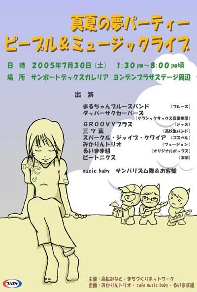 サンポートで 音楽イベントやりますよぉ 「真夏の夢パーティー ピープル&ミュージック」 、ブルース・ジャズ・クラシック・フュージョン・高校生・ゴスペル・演劇の仲間が一同に会し、異文化の風を吹かせる 一日 これは、もう 一見の価値あり!! 一緒に音楽を体で感じてみないか!! http://mixi.jp/view_diary.pl?id=25975686&owner_id=1833