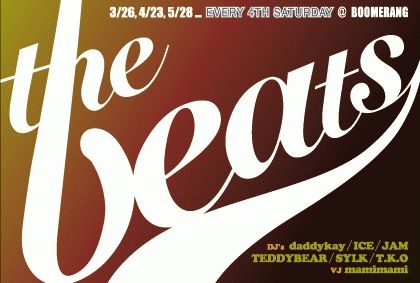 bmr等でライターとしても活躍中の、 daddykay、JAM、TEDDYBEAR、ICEらがオーガナイズする ブラック・ミュージック好きの為のイヴェント、 「the beats」開催のお知らせです! 今月も第4土曜日、8/27に開催! TEDDY BEAR、T.K.O制作の新作MIX CDを 先着で30名にプレゼントします。 新譜から隠れクラシックまで、 ブラック・ミュージックに精通したDJ陣による プレイをお楽しみ下さい。 ■the beats 日時:毎月第4土曜日(8/27) 9PM - 5PM 場所:六本木「BOOMERANG」    港区六本木3-14-25 Morikawa Bidg. 3F