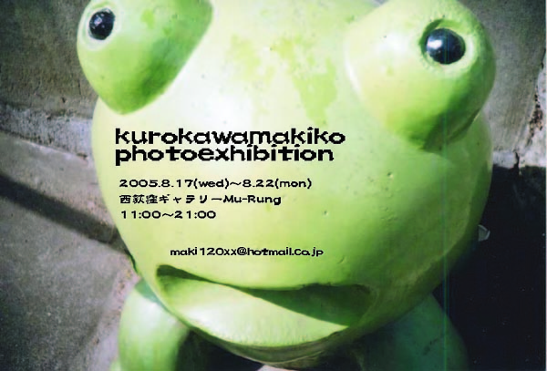 はじめまして。まきといいます。 8月17日(水)からチキンライスのお店「夢飯」のギャラリーMu-Rungにて下記の日程で写真展をしますので散歩がてら、チキンライスを食べがてらのぞいてみていただけると嬉しいです。 よろしくお願いします。 会 期:2005年8月17日(水)〜22日(月) 時 間:11時〜23時 <最終日は21時まで> 会 場:ギャラリーMu-Rung(03-3394-9191) http://muhung.fc2web.com/ 東京都杉並区西荻北3-21-2 徳田ビル1F JR 中央・総武線 西荻窪駅北口(改札出て左側)徒歩2〜3分