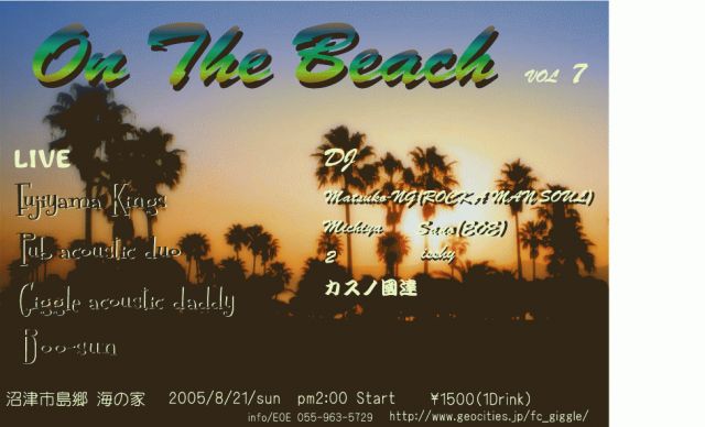 島郷 海の家 にてイベントやります。 今年で7回目となりました。 今回は、地元で活躍中のバンド&DJでお届けします :ジャンル=SKA/Reggae/ジャグ/アイリッシュ/JAZZ :LIVE= FUJIYAMA KINGS/Kaori Accdion/Pub acoustic Duo/ Giggle acoustic Daddy/ リリパット/Boo-Sun/Clover's Clover Guest BAND/THE 69 YOBSTERS(Skinhaed Reggae)      :DJ/ MICHIYA/Ishikawa/Sano(EOE)/2(Giggle)/カ