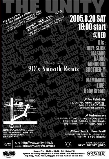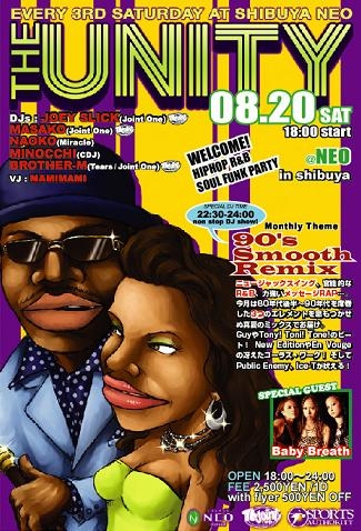 8月の"THE UNITY" Vol.20は 8/20(Sat)に開催しま〜す! (毎月第3土曜日開催中!) ☆今回も渋谷NEOで18:00〜の開催となります! ★時間と開催時間にご注意下さい! 今回のテーマは" 90's Smooth Remix "です。New Jack Swingを含む'80後半〜'90前半のR&Bと、イキオイのヨカッタHiphopをブレンドしてお送りします!LIVEはMeYou以来久々に女性が登場!2Singers+1MCのBaby BreathがバックダンサーLick Backを引き連れてTHE UNITYのフロアをロック!もちろんTHE UNITYのテーマに併せて'90 R&Bのカバーも熱唱します! 8月のTHE