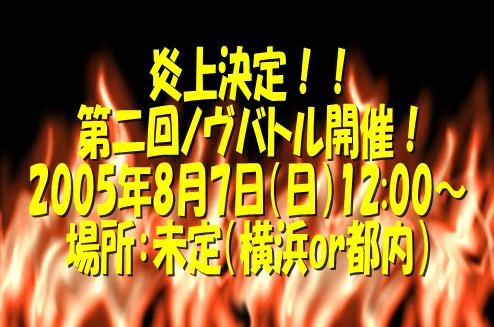 来る8月7日にノヴバトル開催しまーす♪ 場所はまだ未定ですが、横浜中華街とかええなー とか思いつつ、夏休み中の日曜日は鬼のように混雑 するだろうから、やっぱ田園都市線沿いかなあとか 、思い切って都内とか色々考え中。。。 とりあえず昼からはじめてそのまま飲んだくれます(爆) 現在すでにかなーり濃い面子が参加表明済みですか ら、みなさんもふるってご参加くださいませ! 会費は3〜5000円の予定でーす!