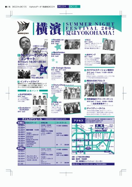 山下地区活性化委員会(TEL 045-663-1242)は8月6日と7日、山下公園石のステージ・お祭り広場で「横濱 SUMMER NIGHT FESTVAL 2005」を開催する。クレイジー・ケン・バンドコンサート、横浜のストリート等で活動するインディーズバンドのライブ、「横浜大日本プロレス」の試合、フリーマーケット、横浜を代表するBARが出店する「カクテルステーション横濱」などがおこなわれる。 クレイジー・ケン・バンドコンサートは7日18時30分から20時30分まで(同日12時から整理券配布)。入場無料。雨天決行。 http://www.hamakei.com/headline/883/index.h