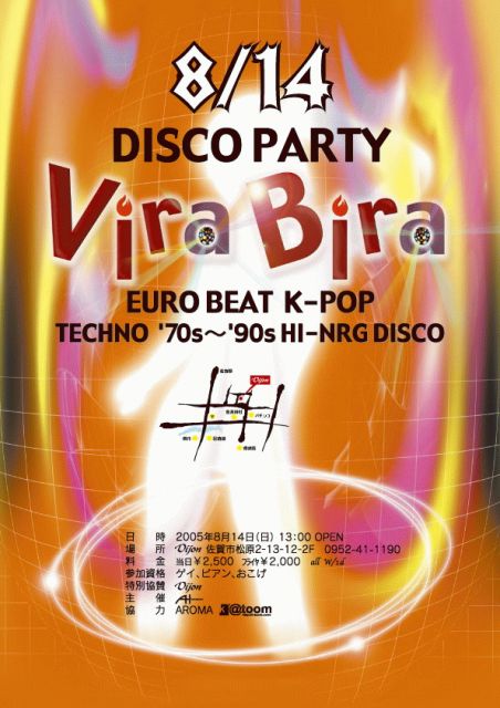 ■音楽ジャンル EUROBEAT K-POP TECNO '70s〜'90s HI-NRG DISCO ■タイムテーブル 13:00 EUROBEAT 14:00 TECHNO 14:35 '80s〜'90s HI-NRG DISCO 15:35 パラパラ講習 15:45 J-EURO 〜 K-POP 16:45 TECHNO 17:15 '70s〜'80s DISCO 17:45 TECHNO ■参加資格 ゲイ、ビアン、おこげ ■主 催 AH Corporation ■特別協賛 Dijon ■協 力 AROMA k@toom PC http://www.d-hd.net/ahc/ 携帯 http://www.d-hd.net/ahc/m/
