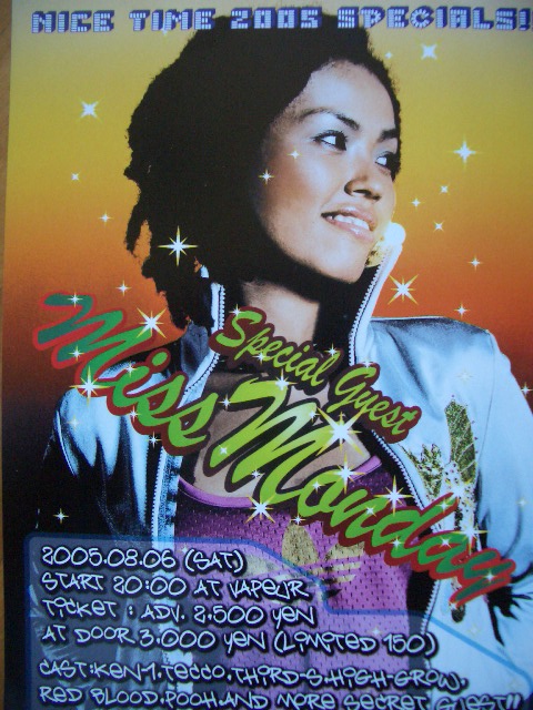 ・いよいよ明日は待ちに待ったMiss Mondayが鳥栖にやってきます。いやみにも私のバースデイ。お祝いがてら遊びに来てください。 タイトル:NICE TIME 2005 SPECIAL!! 日時-8/6(土)場所-VAPEUR(佐賀県JR鳥栖駅前) 料金-\2500 時間-8:00〜翌3:00 ジャンル-LIVE,DJ 出演-GUEST:Miss Monday http://www.missmonday.com/ BIGGA RAIJI Therd-S,RED BLOOD,HIGH-GROW,Tecco,POOH 問い合わせ-VAPEUR 0942−87-5586まで