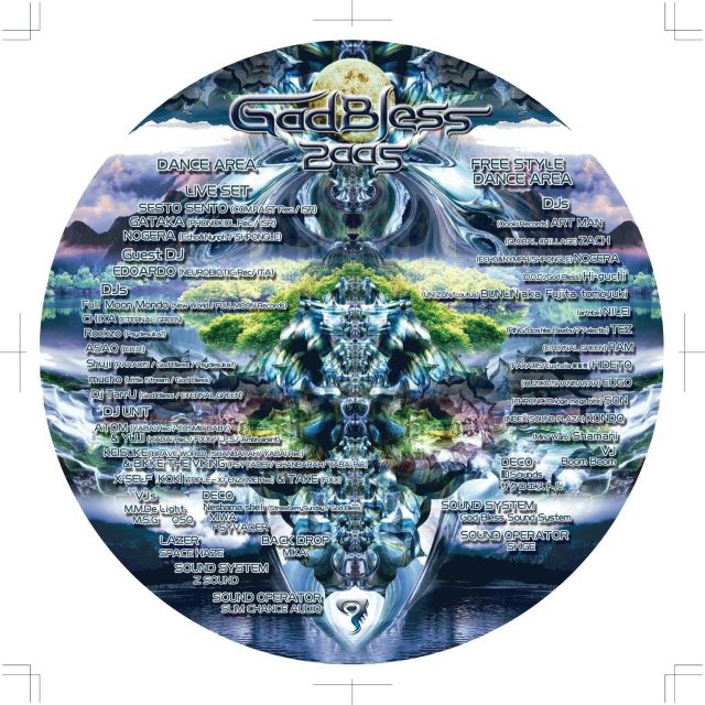GodBless music Festival 2005 箱館山スキー場(SIGA) 2005.08.20(sat)~21(sun) ADV. 5,500YEN. DOORS 7,000YEN MORE INFO http://www.god-bless.jp/ *DANCE AREA * *LIVE SET* Sesto Sento (COMPACT Rec / ISR) GATAKA (PHONOKOL Rec/ ISR) NOGERA (ECHO&NYMPH/SHPONGLE) *Guest DJ* Edoardo (Neurobiotic Rec / ITA) *DJ* Full Moon Mondo  (New World/FullMoon Rec) CHIKA (ETERNAL GREEN) Rockzo  (Soil / Psydesuka?) ASAO  (D.D.D.) Shuj i  (PARADIS/God Bless/ Psydesuka?) mucho