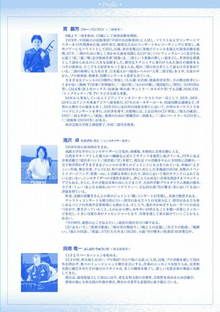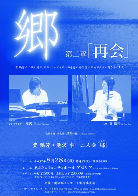 二胡奏者ジャー・パンファンとシンセサイザー奏者滝沢卓のジョイントコンサート「二人会」が来る8月28日(日)富山県朝日町アゼリアにて開催されます。 富山県近辺の方は、是非お出かけ下さい。 詳しくは滝沢卓ホームページで http://www3.ocn.ne.jp/~rara/