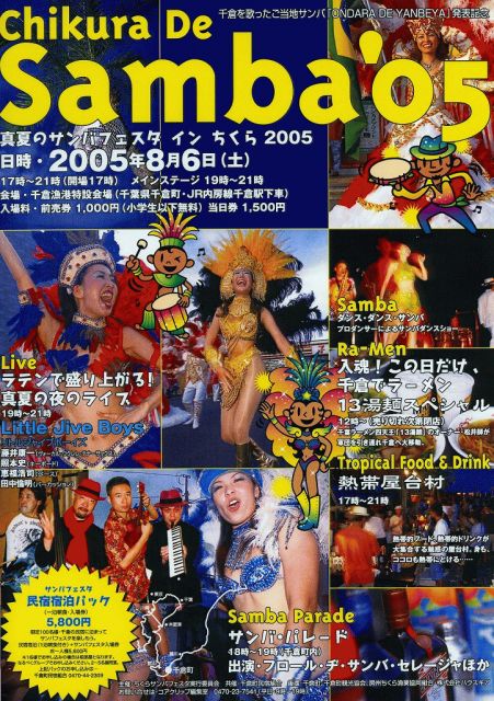 南房総ラテン化計画 Chikura De Samba 05 真夏のサンバフェスタ イン ちくら2005 2005年8月6日(土) 17時〜21時 メインステージ19時〜21時 会場・千倉漁港特設会場(千葉県千倉町・JR内房線千倉町下車) 入場料・前売り1000円(小学生以下無料)当日1500円 今年で2回目になるChikura De Samba は昨年より パワーアップしてやってくる! 熱帯屋台村のテンポも増え、商店街サンバパレードでは 千倉のサンバチーム「ONDARA DE YANBEYA」も参加! メーンステージもよりグレードアップします。 出演 Little Jive Boys、With 田中ミチア