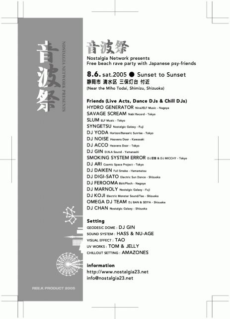 NOSTALGIA PRESENTS ○● 音波祭 ●●○○○ Beach Rave Partie With Japanese Psy-friends KIN115 青いスペクトルの鷲 私は創り出すために溶かす 心を解き放ちながらヴィジョンの出力を封印する 解放のスペクトルの音で 私は自らの二重の力に導かれる 私は極性キン 私は青い銀河スペクトルを輸送する 私は銀河の活性化の正門 私に入りなさい ******************************************* この日、僕達は海の向こうに平和を祈ります。 http://www.pcf.city.hiroshima.jp/peacesite/ ************************