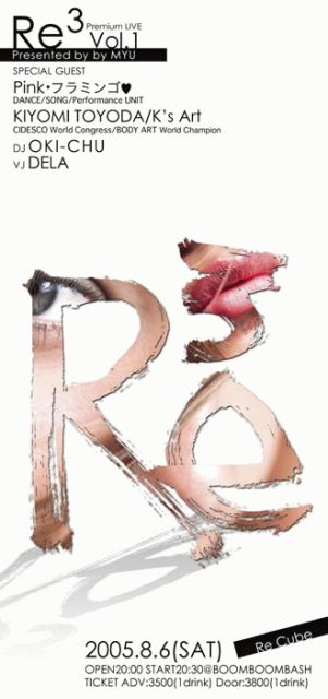 ☆☆☆やったぁー!Pink・フラミンゴが静岡にやってきま〜っす☆☆☆ 『もう、クラブイベントに飽きた』というアナタや遠巻きに見ているだけのアナタにも朗報!見て、聞いて、感じて楽しみたい!そんな五感を刺激するイベント『Re3/リキューブ』のゲストライブでPink・フラミンゴが素敵に華麗にせくすぃーに舞いますよーっ!! 8/6(土) PLACE : BOOM BOOM-BASH http://www.s-spirits.net/boomboom_bash/ OPEN : 20:00 START : 20:30 TICKET : ADV/3500YEN(1DRINK) DOOR/3800YEN(1DRINK) ※DOORには限りがあります! LI