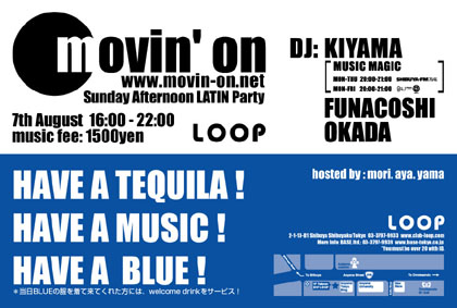 青山の地から良質な音楽を発信し続け、今年で10年目。はや老舗の風格 さえ漂うCLUB[LOOP] 国内では最もSUNDAY-AFTERNOON-PARTYが行われているCLUBでもあります。このLOOPにて毎回偶数月の第一日曜日に行われているPARTY、[movin'on]では、10年以上のキャリアを重ねてきた三人のDJ達が毎回異なるGENREでのPLAYを披露!FLOORを楽しませてくれます。今回はLATIN-HOUSE。夏真っ盛りの日曜日の夕方、渋谷のど真ん中で南の国気分を楽しんじゃいましょう!! また毎回代わるTHEME COLORはロイヤルブルー。このカラーを身につけて遊びに来てくれたれた人には
