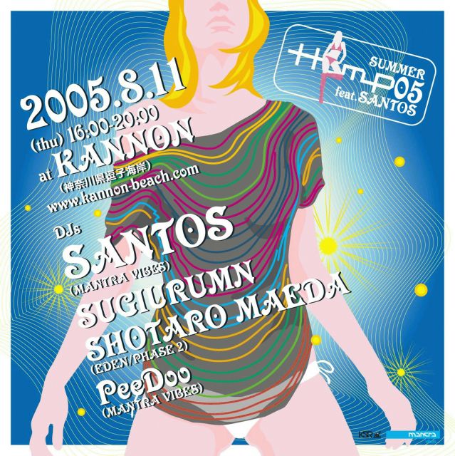告知させてください。 逗子にSANTOS連れて行きます。 SUMMER HUMP05 8/11 (THU) 16:00-20:00 @KANNON (逗子海岸) DJ SANTOS (MANTRAVIBES ) PEEDOO (MANTRAVIBES) SHOTARO MAEDA (EDEN / PHAZE2) SPECIAL GUEST (TBA) ENTRANCE FEE ¥2,500 イベント紹介文 逗子海岸に常夏DJ襲来!! 昨年アルバム『Abrasive』で日本デビューを飾り、Fuji Rock Festival 04では3000人のオーディエンスをKO、FATBOY SLIMも絶賛するイタリアのお祭りスタリオン、SANTOSが9月中旬発売のニュー・アルバムの発売を直前に控え、今夏、急遽来日決定