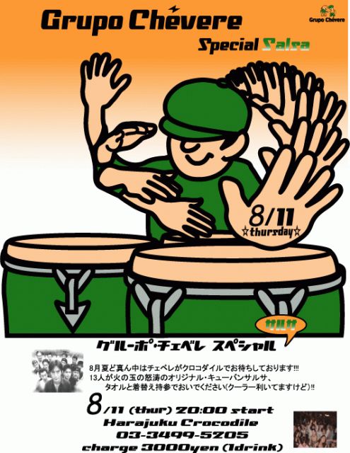 サルサ・ファンの皆様こんにちは!!! この場をお借りしまして、『グルーポ・チェベレ』のライブの宣伝をさせてください。 8月11日(木)20時〜 原宿クロコダイル3499-5205 http://www.music.co.jp/~croco/index2.html 『グルーポ・チェベレ』HP http://www.chevere.jp/ よろしくお願いいたします!!!!!!