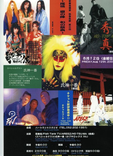 名古屋の「ROCK BAND歌舞伎」主催のライブイベント。 愛・地球博でのライブ共演が縁で、今回ご招待を受け、我々「秀真/HO-TSU-MA」も鎌倉より参戦致します。(ちなみに「秀真…」のKey,古橋氏は、名古屋出身デス♪) 出演者は… ☆「歌舞伎」 (http://www.rb-kabuki.com/) ☆「秀真/HO-TSU-MA」 (http://www.ho-tsu-ma.jp) と、 ☆大阪の「ARESZ」 ☆名古屋の「Fish Tank TV」、 そしてSpecial Guestに、 ★江戸の「氏神一番」(KABUKI ROCKSのVo.で江戸文化研究家♪) …を迎えて、濃い〜一夜をお送りします! 18時 開場、