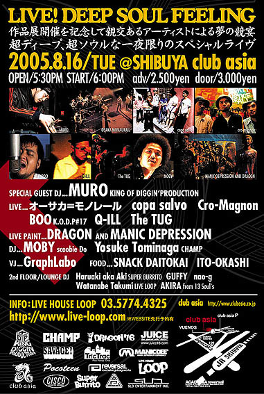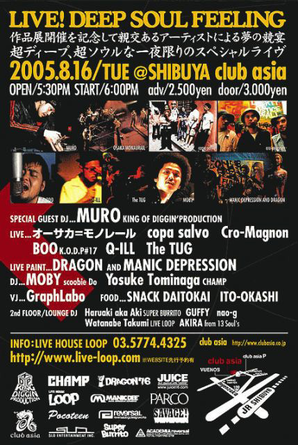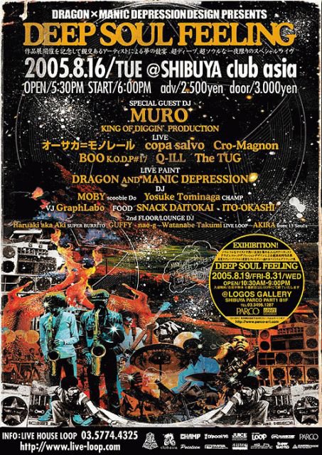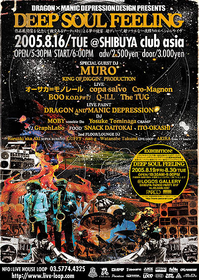 渋谷パルコ/ロゴスギャラリーで8.19から12日間開催のエキシビジョンDRAGON×MANIC DEPRESSION DESIGN「DEEP SOUL FEELING」(詳細は別項目参照ください)を記念して親交あるアーティストによる夢の競宴が決定しました。超ディープ、超ソウルな一夜限りのスペシャルライヴをお見逃しなく! DRAGON×MANIC DEPRESSION DESIGN PRESENTS 「DEEP SOUL FEELING」 ■2005.08.16 TUE@SHIBUYA CLUB ASIA ■OPEN/17:30 START/18:00 ■adv/2.500yen door/3.000yen ■web予約>> http://www.live-loop.com/ ■問合>> LIVE HOUSE LOOP企画室 : 03-57